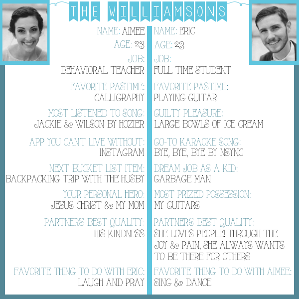 Aimee and Eric are two of the sweetest, most loving and God-fearing people I know. I've known Eric since high school and met Aimee through the Bible study where these two met each other. They're quirky, funny, and so willing to be themselves in all situations. Enjoy getting to know this adorable pair each Thursday during the month of November.